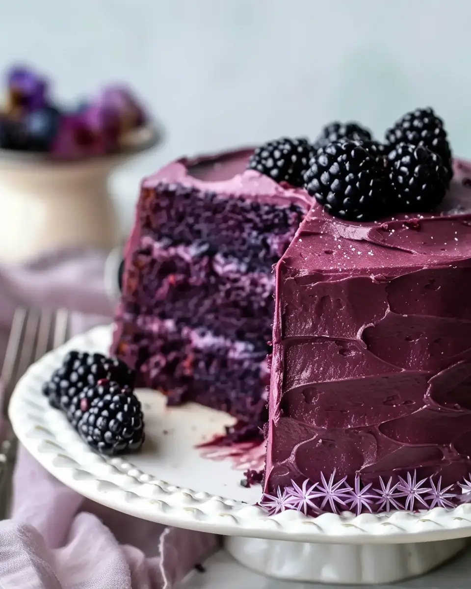 Now, step back and admire your masterpiece! This blackberry velvet cake is not just a treat for your taste buds; it’s a feast for the eyes too. Enjoy serving this stunning cake at your next gathering—your friends and family will be impressed!