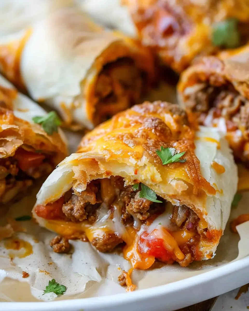 - Place the beef mixture and cheese on each strip, then roll them up.