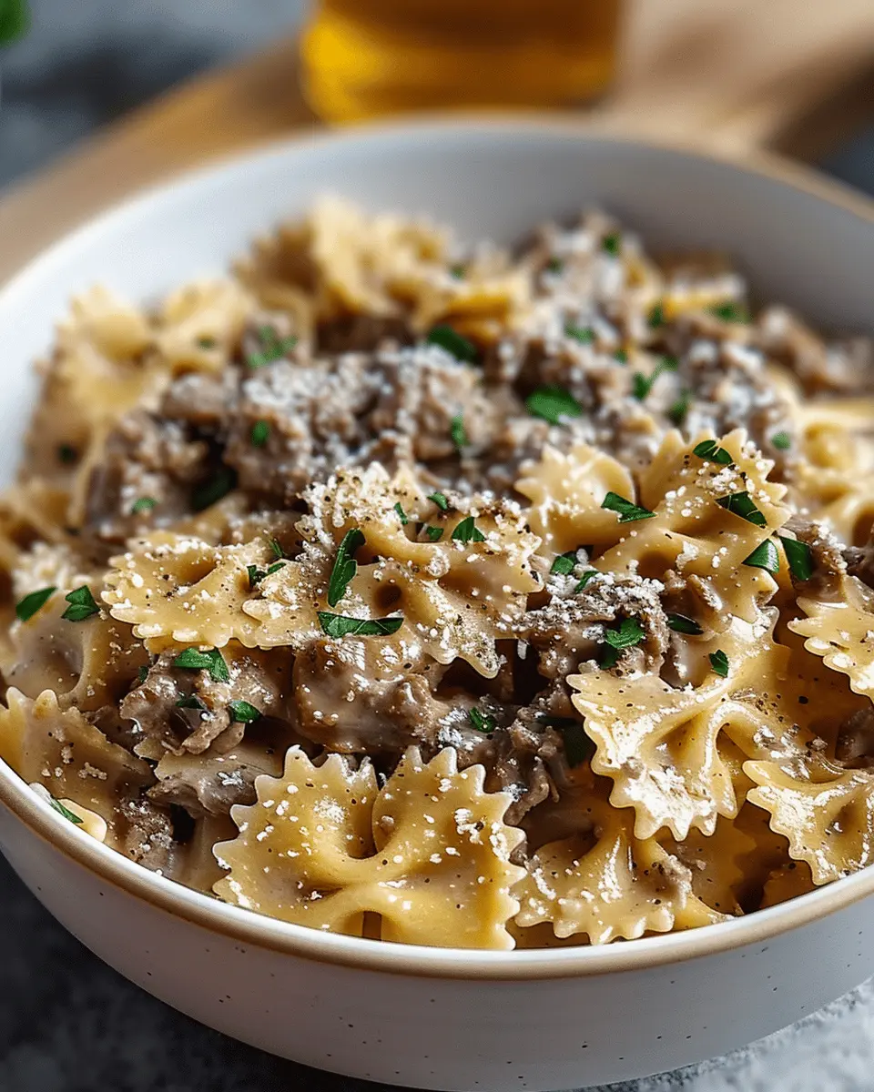 PrintCreamy Parmesan Garlic Beef Bowtie Pasta: The Best Comfort Dish
