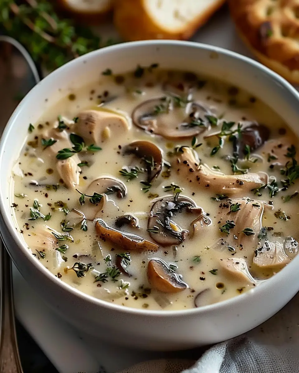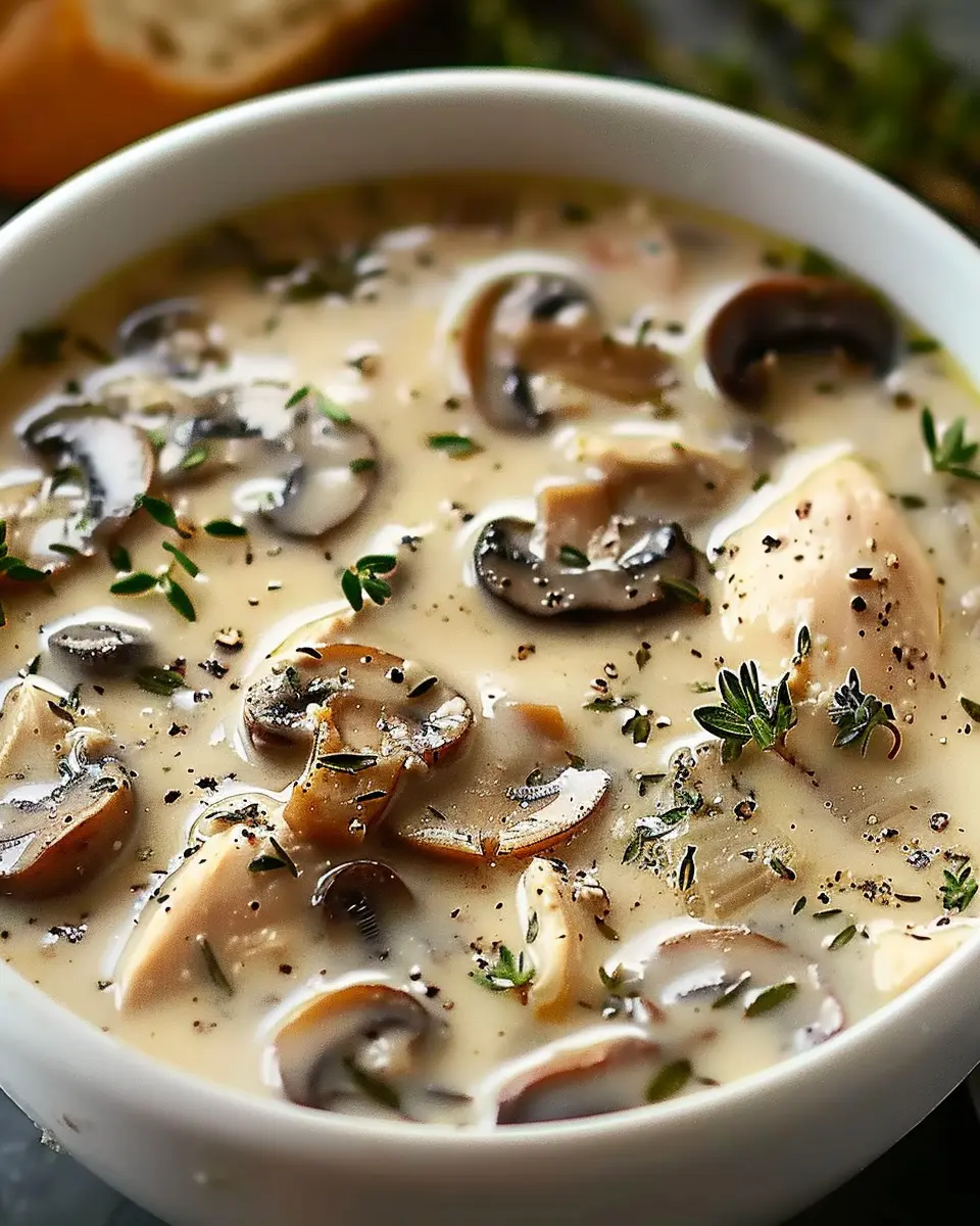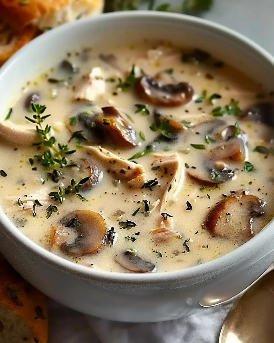 A rich and creamy soup made with tender rotisserie chicken and earthy mushrooms, perfect for cozy nights.