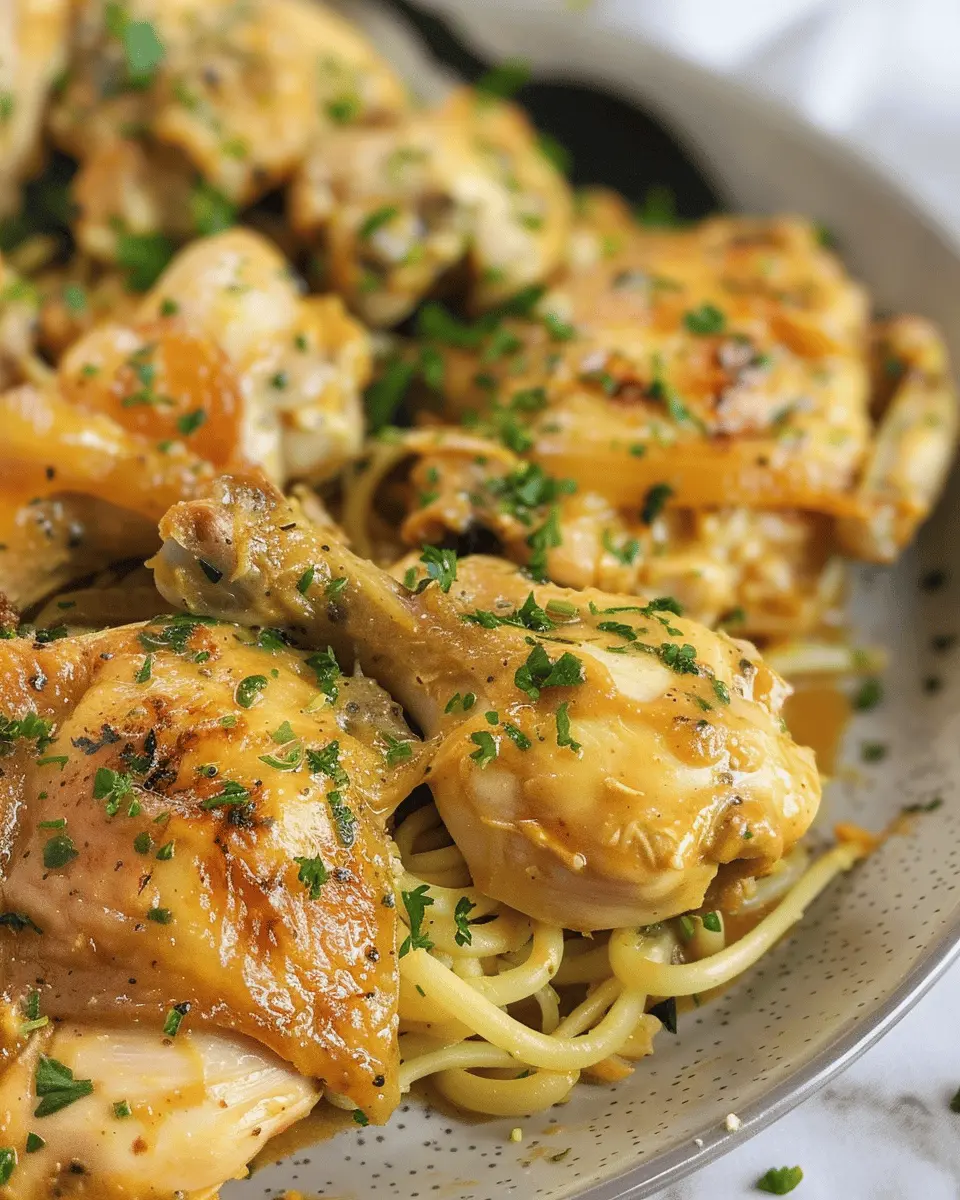 Once it’s done, you can shred the chicken directly in the pot, giving it a good mix with the sauce before serving. It pairs wonderfully with rice or noodles, and you can garnish it with fresh parsley for a pop of color.