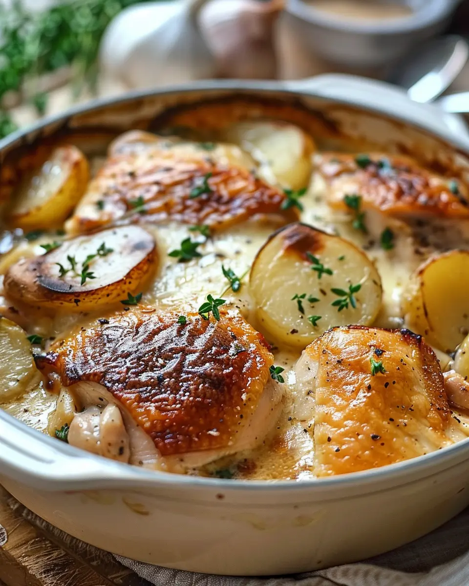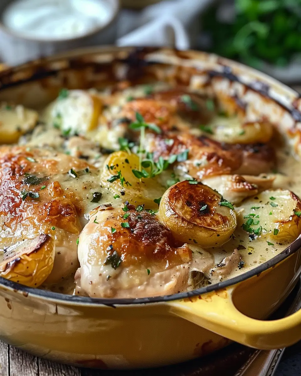 A delicious and creamy casserole featuring tender chicken and turkey bacon, inspired by the classic French dish from Normandy.