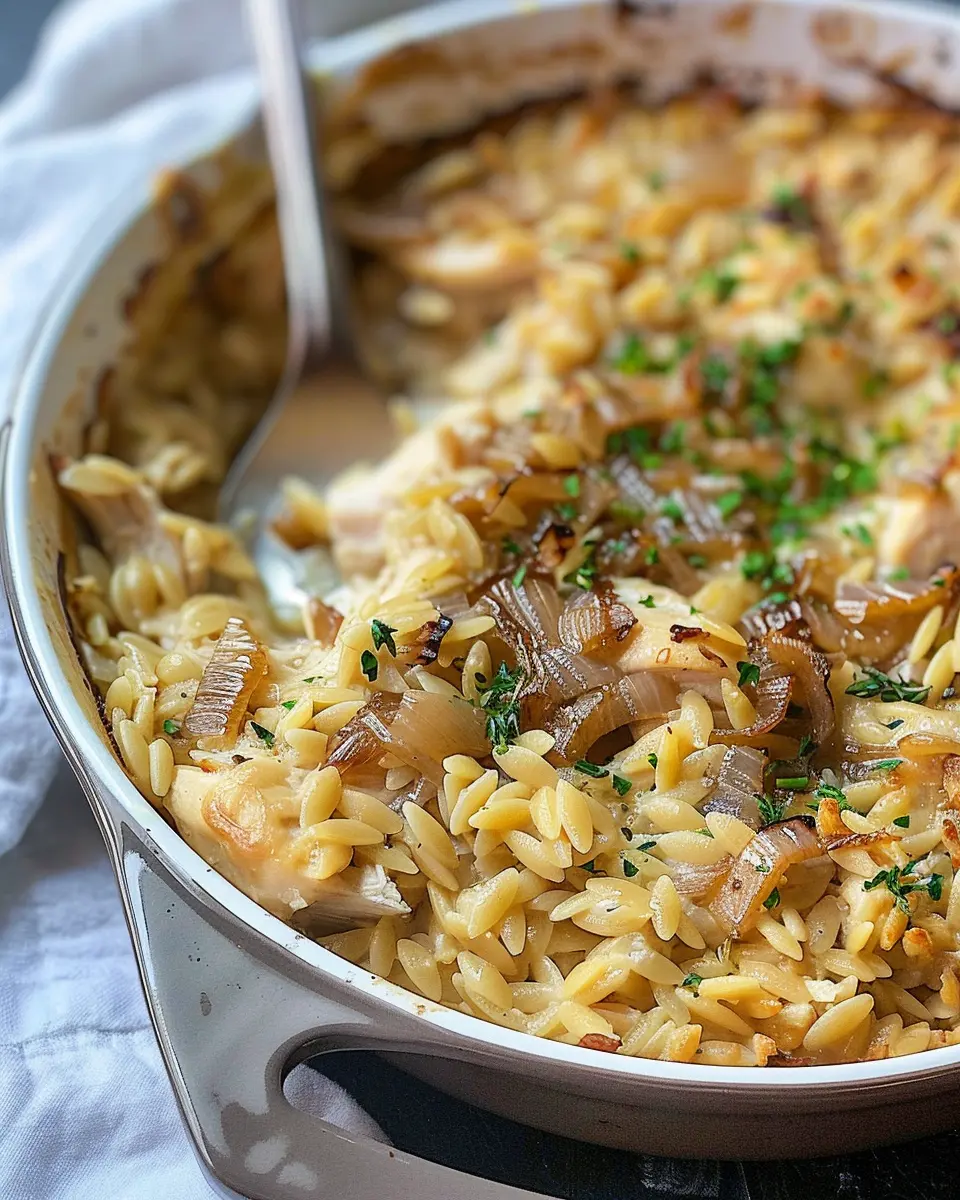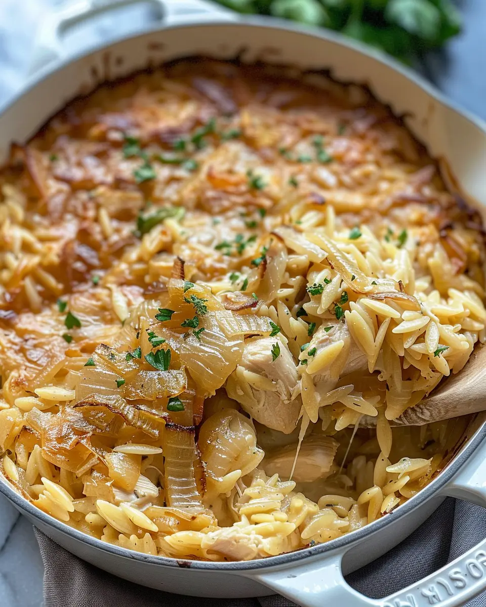 A delicious and comforting French Onion Chicken Orzo Casserole that combines tender chicken, orzo pasta, and the rich flavors of French onion soup.