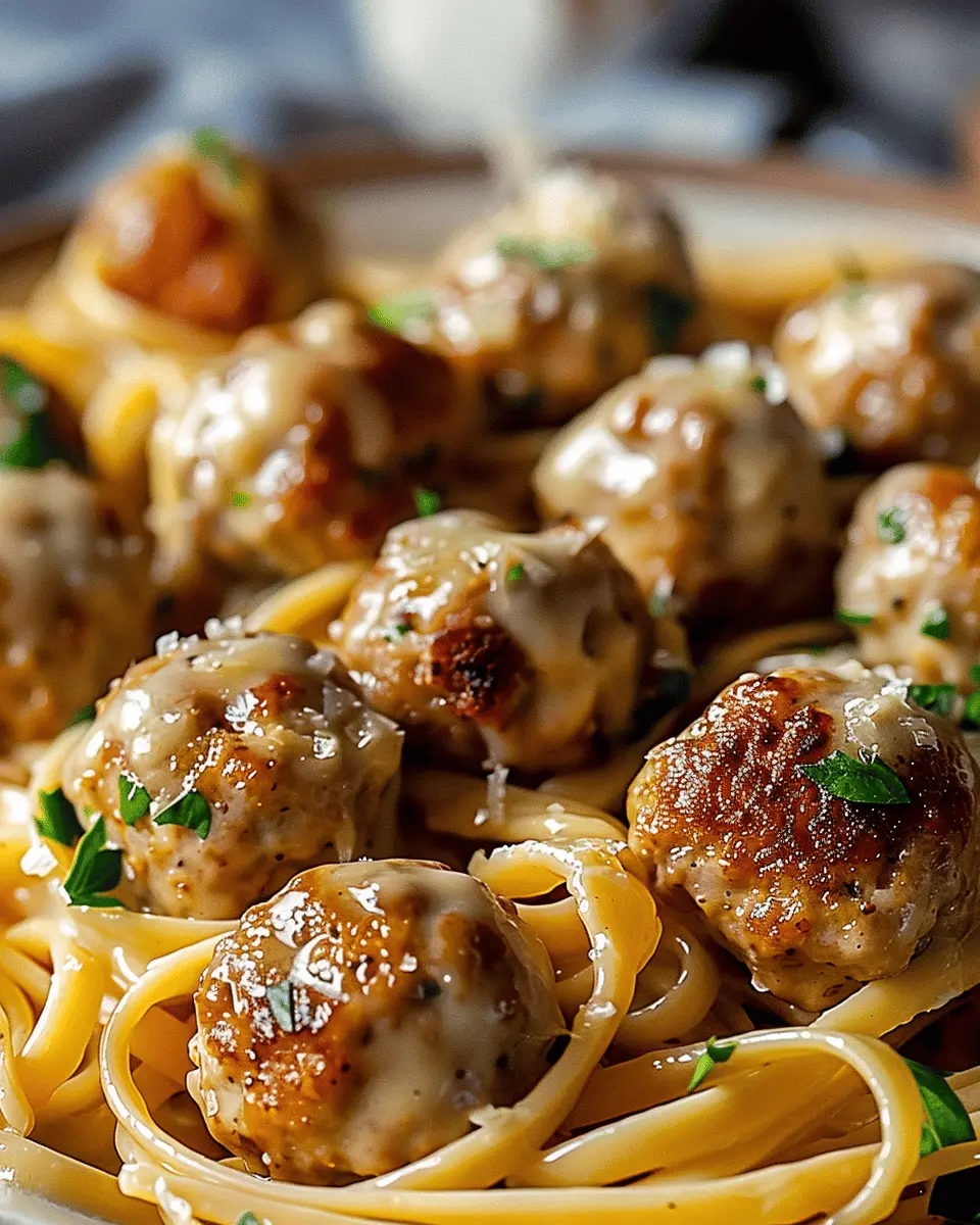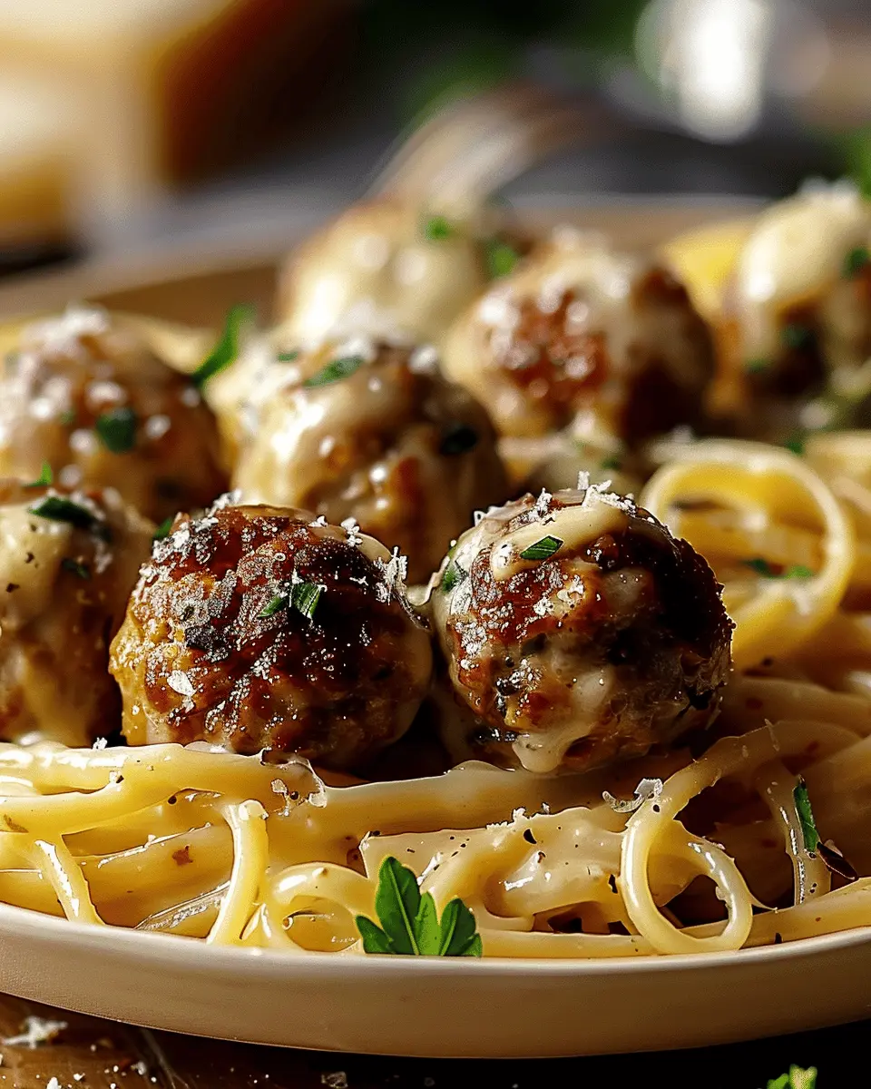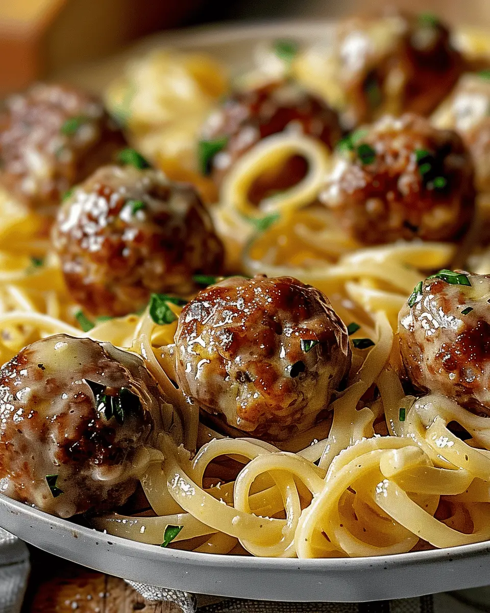 Delicious garlic butter meatballs served with creamy linguine for a delightful meal.