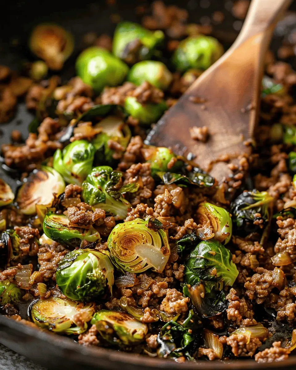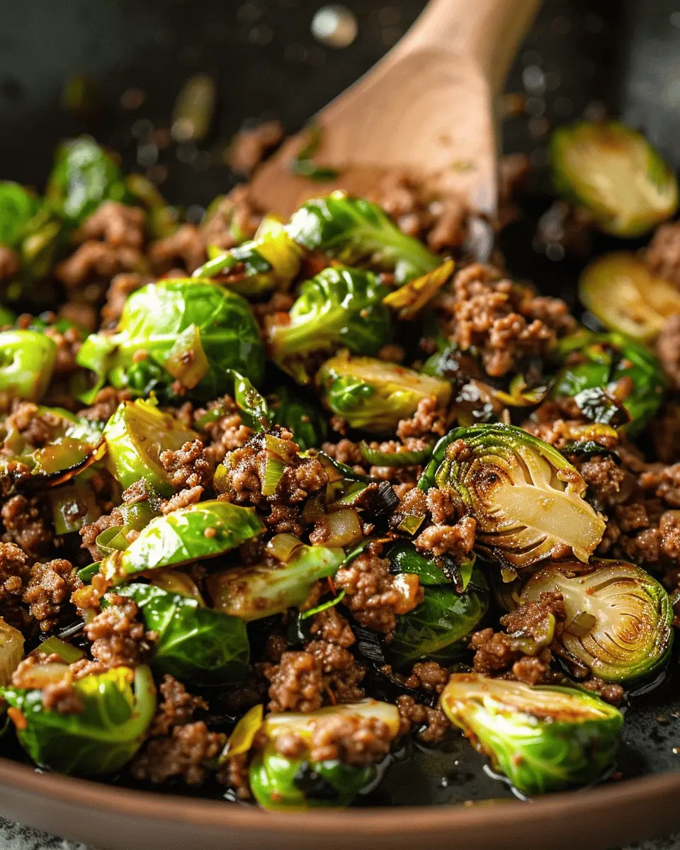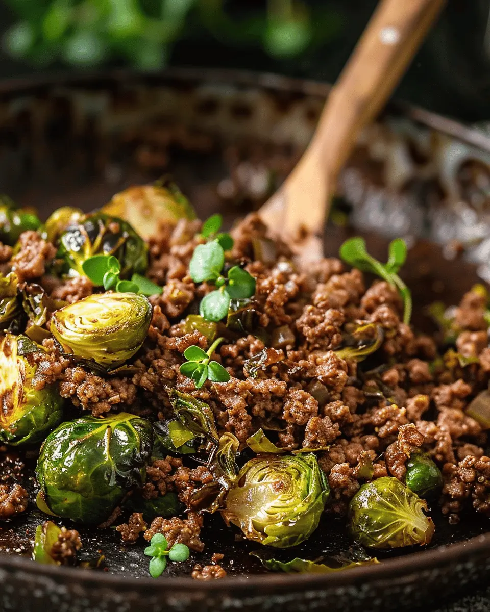 A comforting dish featuring ground beef and brussels sprouts, perfect for a quick weeknight dinner.