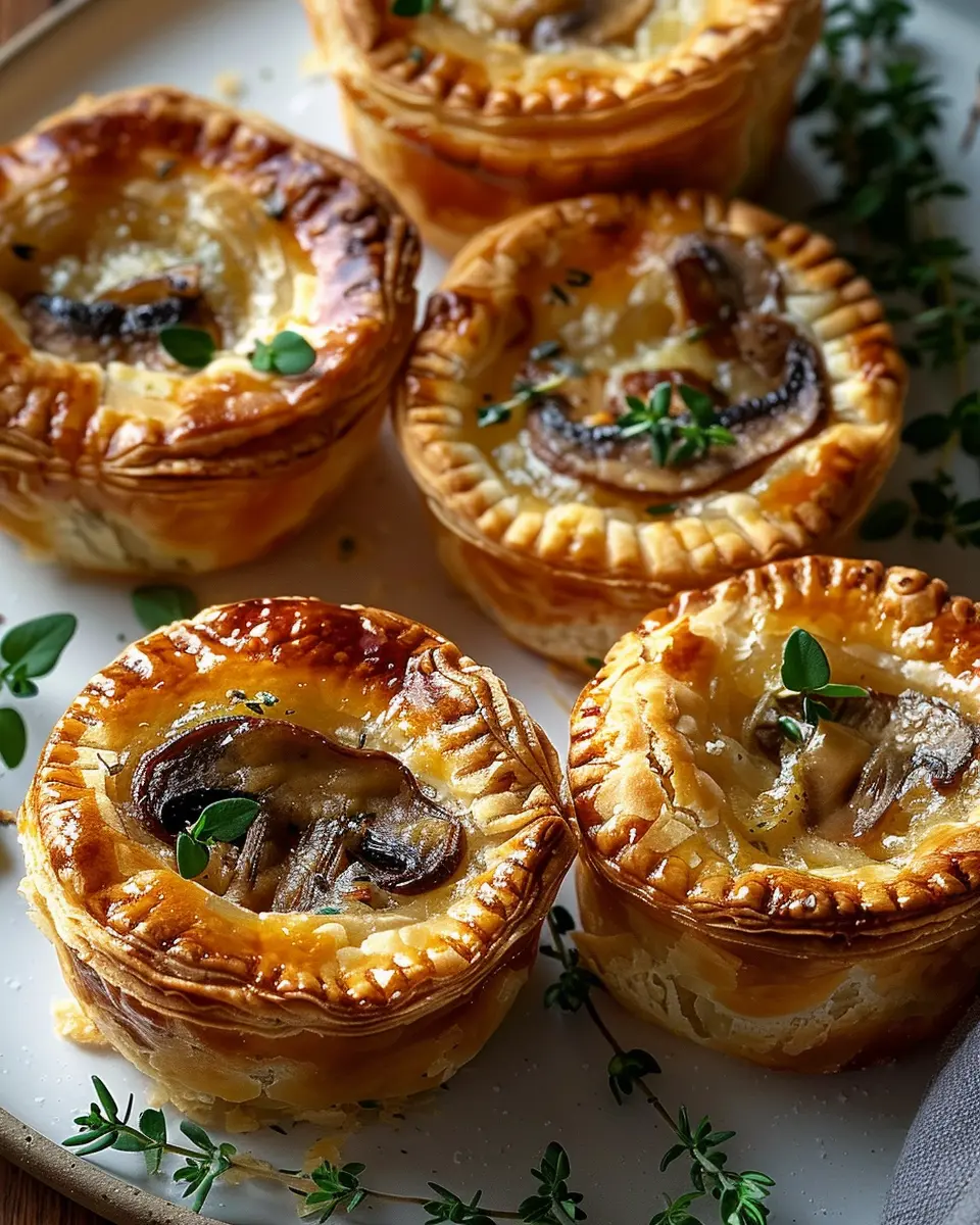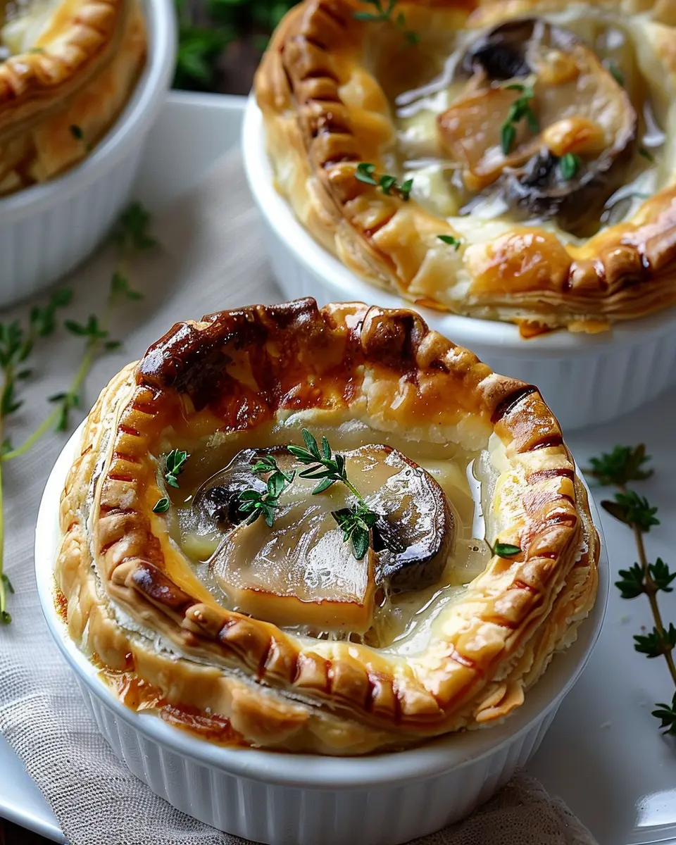 Indulge in these delicious mini mushroom and Gruyère pot pies, infused with fresh thyme for the perfect comfort food experience.