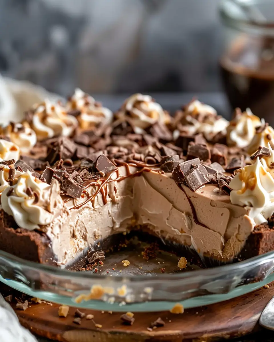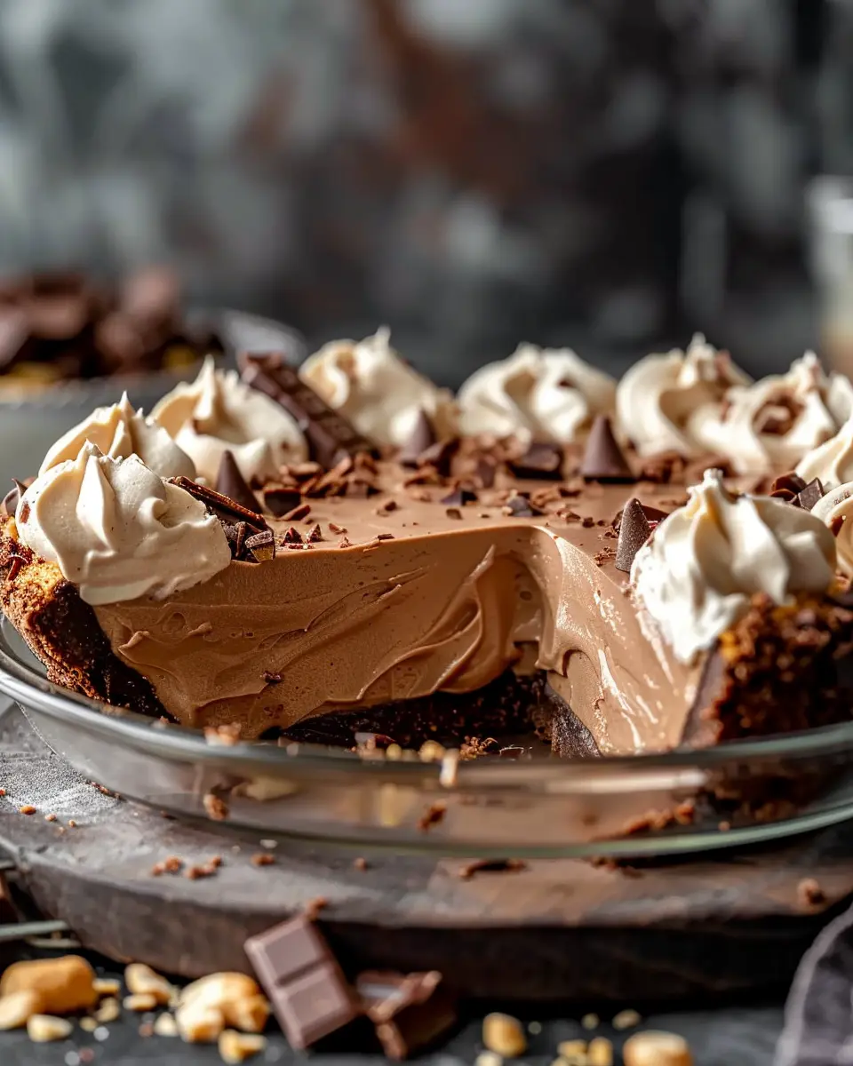 A deliciously rich no-bake pie featuring cream cheese, peanut butter, and a chocolate whipped cream topping.