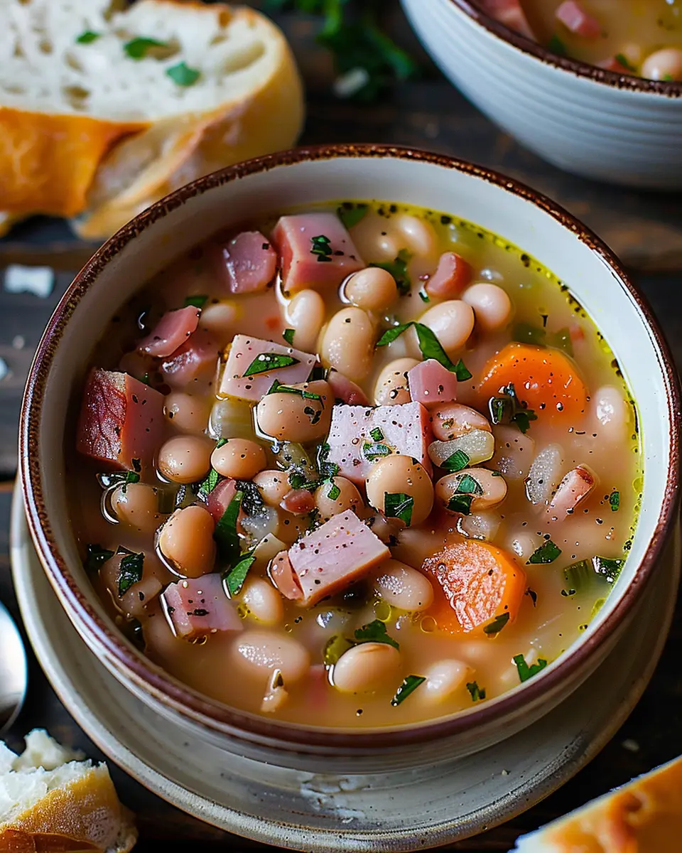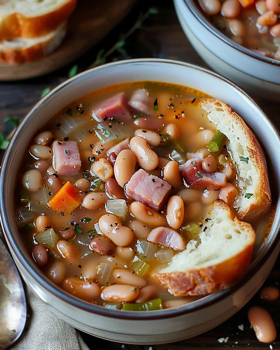 A hearty and comforting ham and bean soup that combines traditional flavors with a twist of turkey bacon.