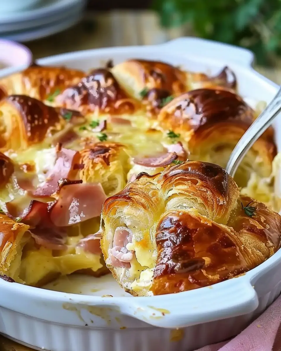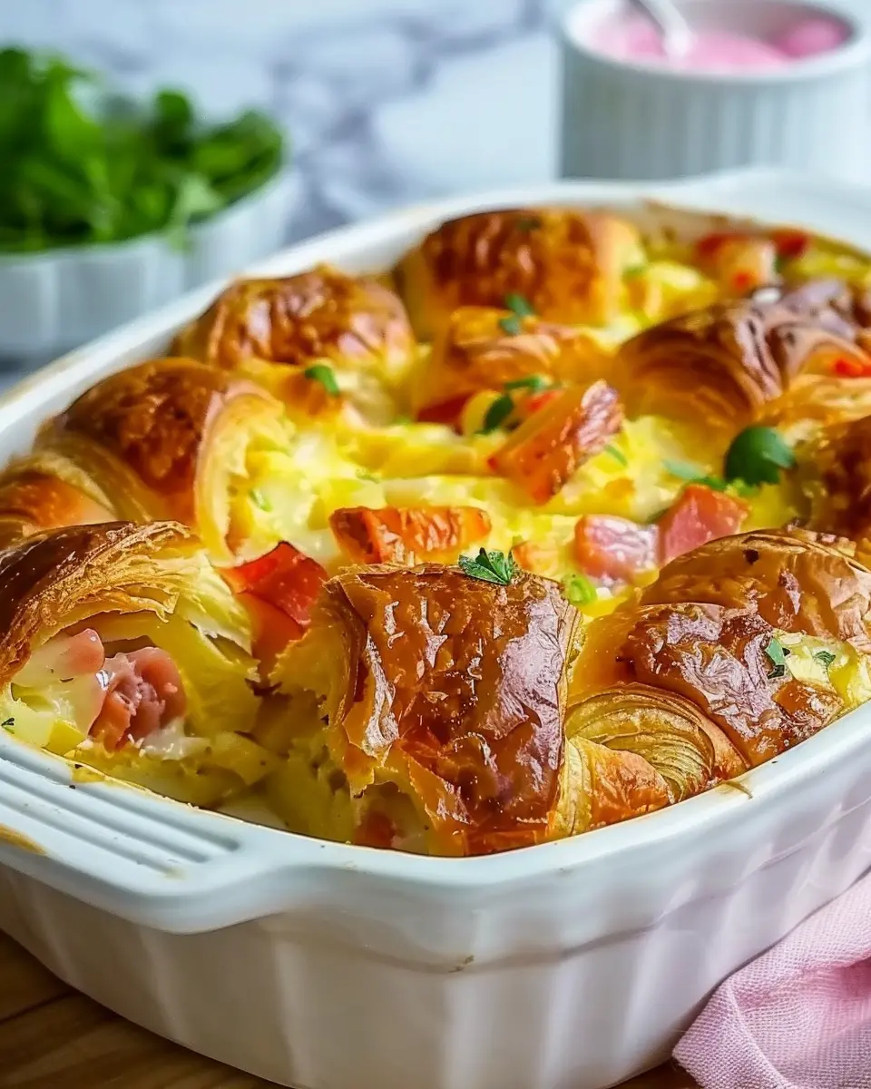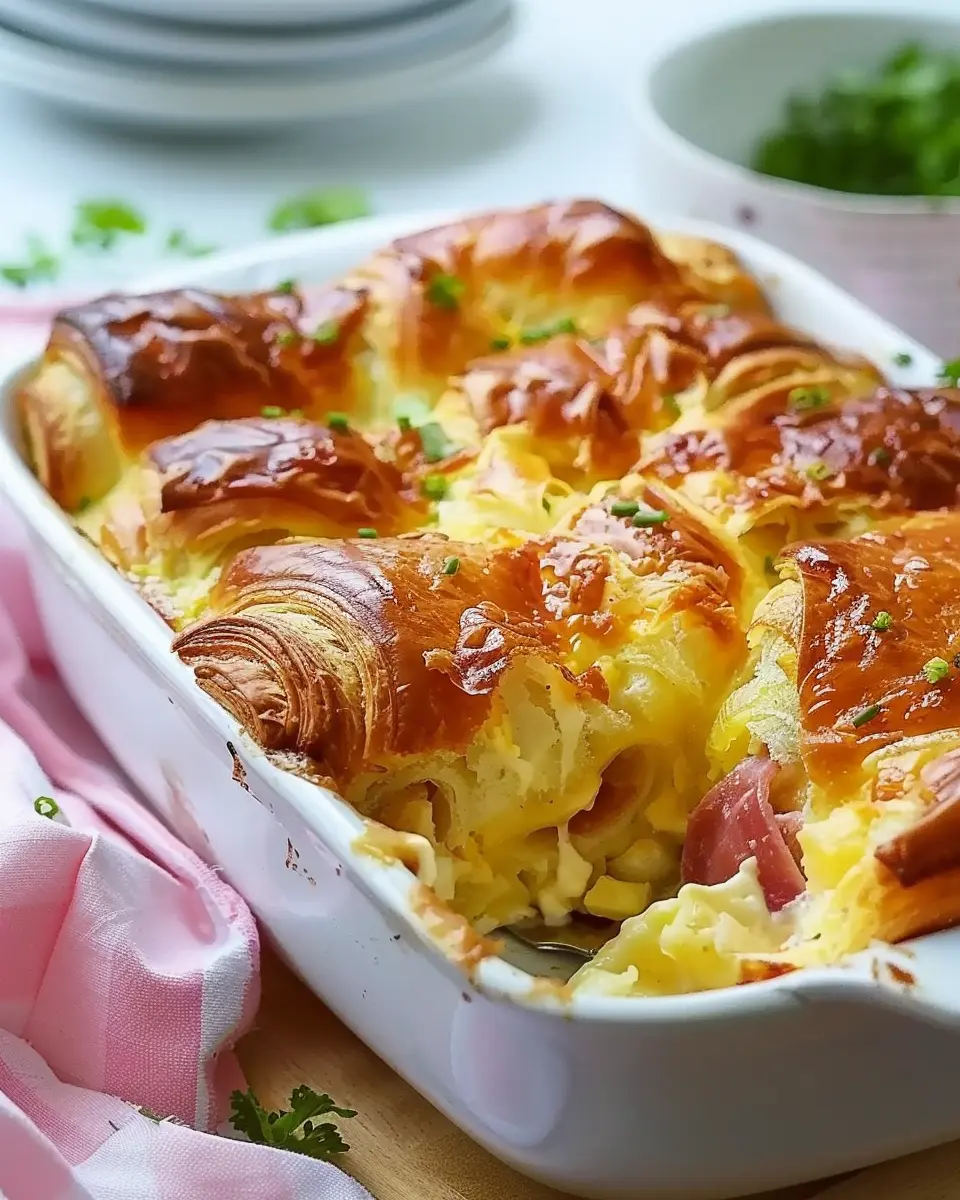 PrintOvernight Croissant Breakfast Casserole: A Must-Try Delight with Turkey Bacon and Chicken Ham