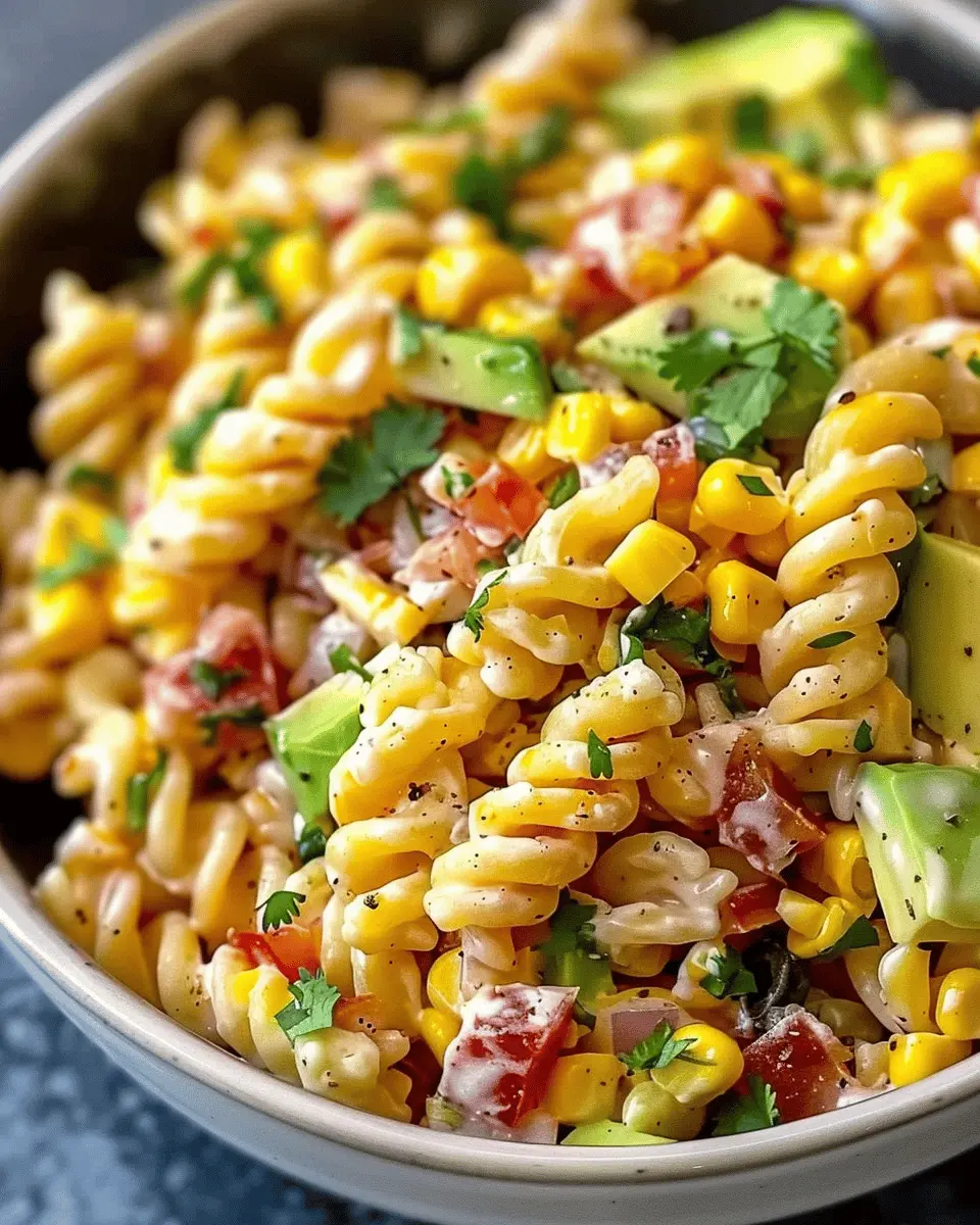 A delightful Mexican-inspired pasta salad featuring corn, turkey bacon, and chicken ham that promises a burst of flavor in every bite.