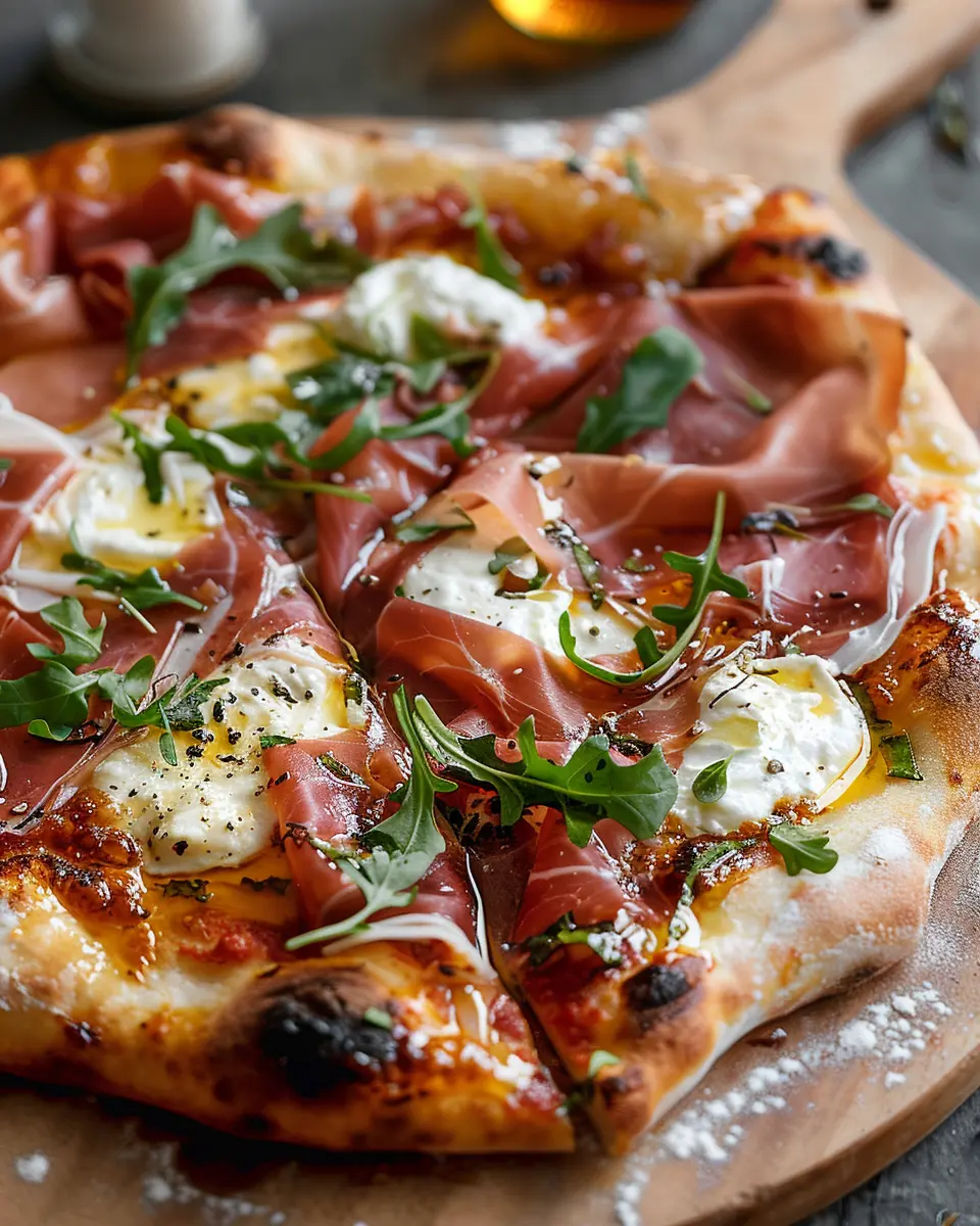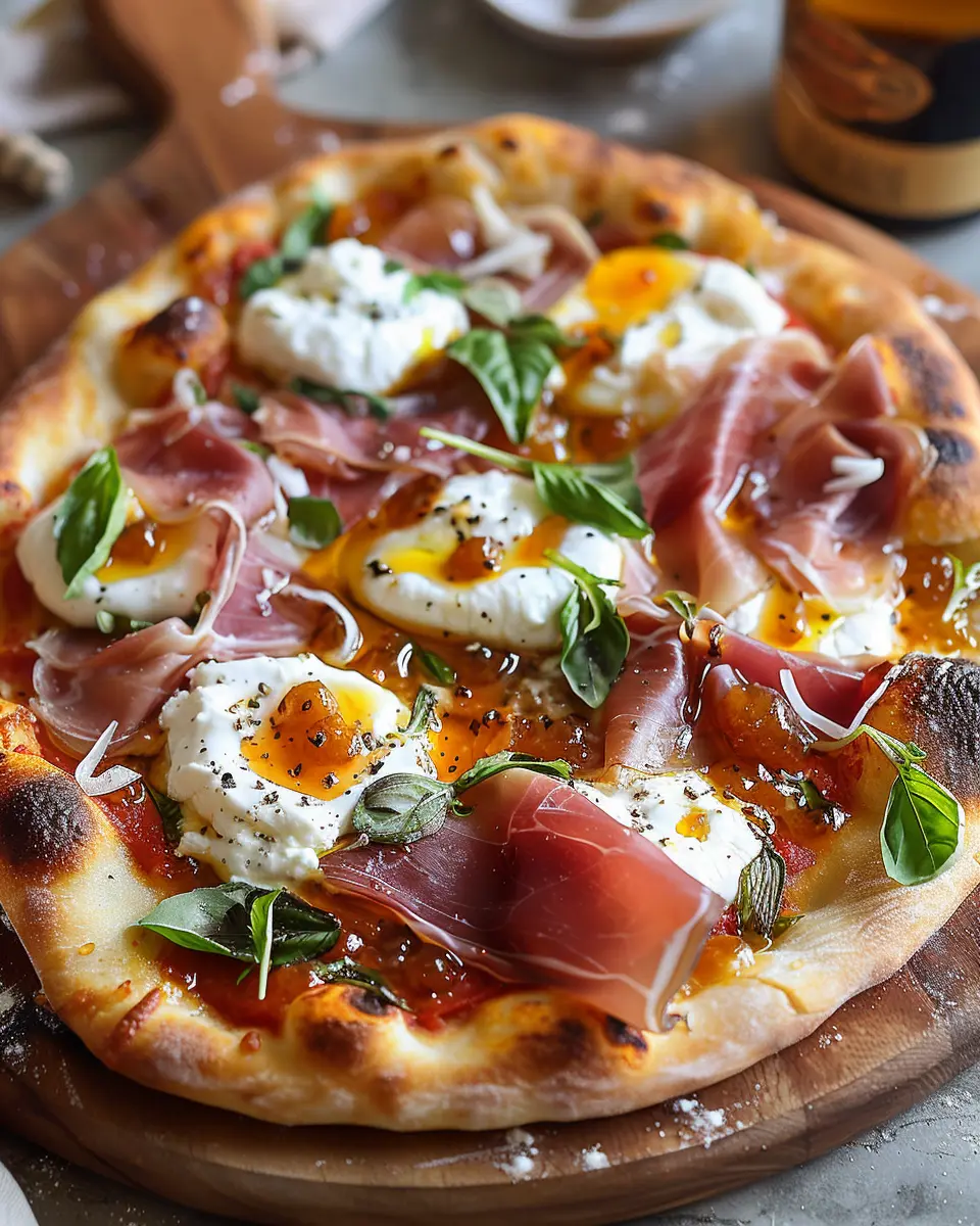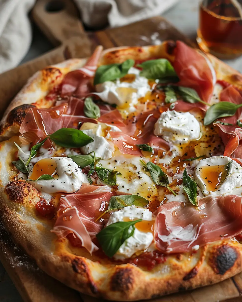 Discover the rich flavors and the perfect balance of sweet and savory in this delicious prosciutto and honey burrata pizza.